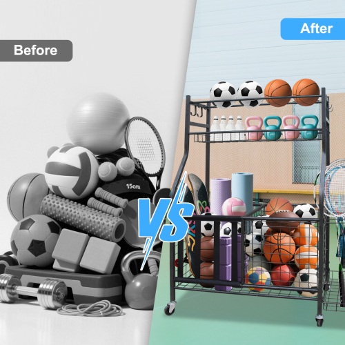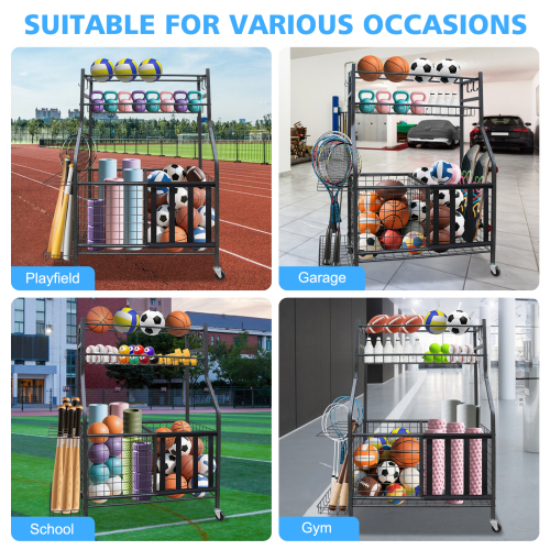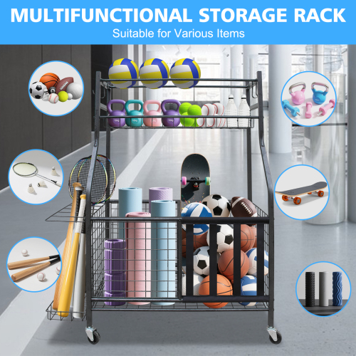 Product Name: Garage Sports Equipment Organizer, Large Capacity Ball Storage Rack, Rolling Ball Cart with Wheels for Indoor & Outdoor