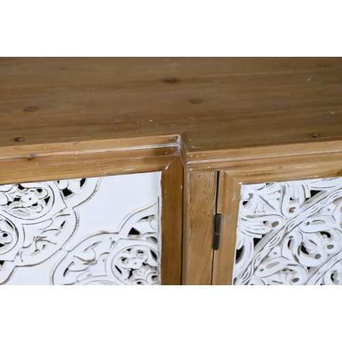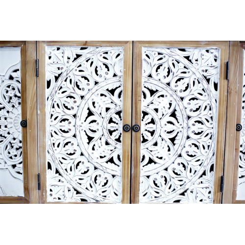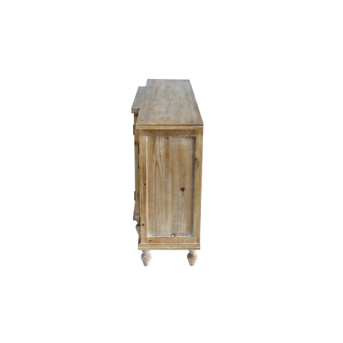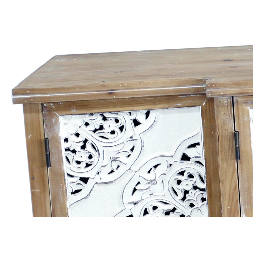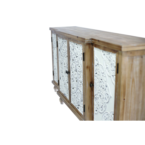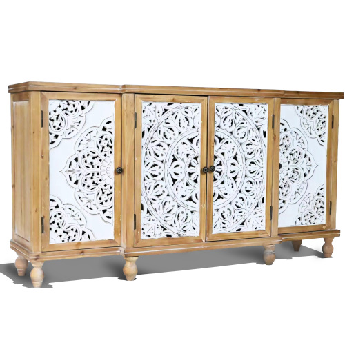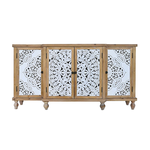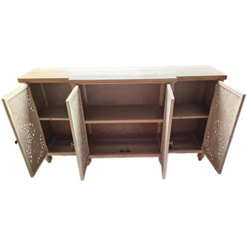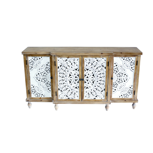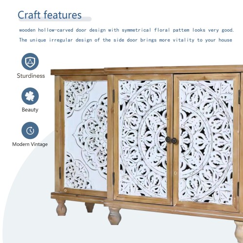 Product Name: 4-Door Hollow-Carved Accent Cabinet, Distressed Wood Storage Cabinet Cupboard with adjustable shelves,unique design for Kitchen, Dining Room, Living Room, Entryway, Natural wood