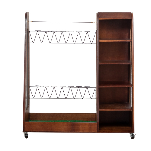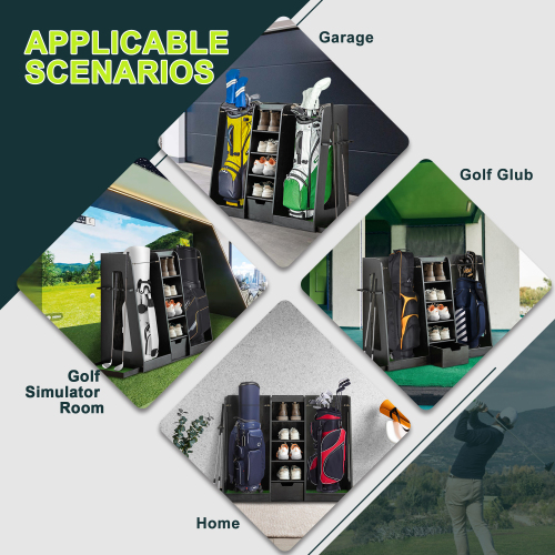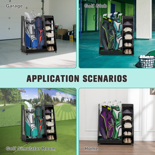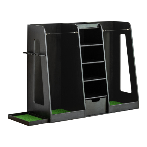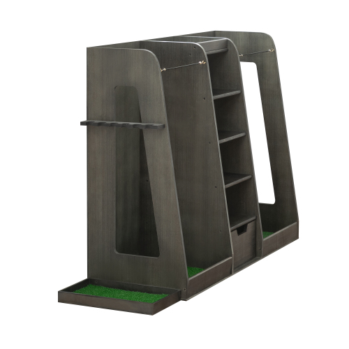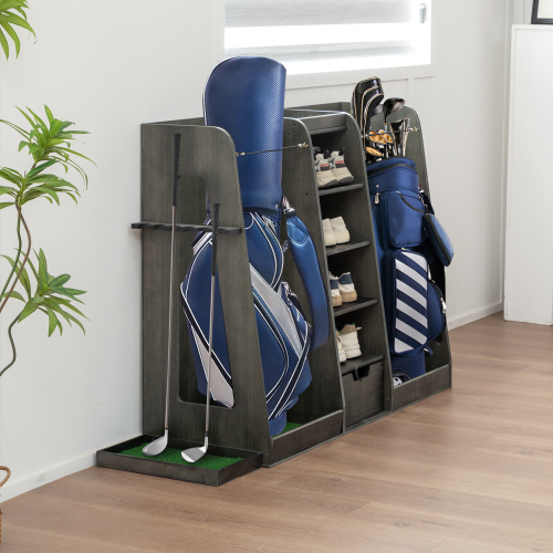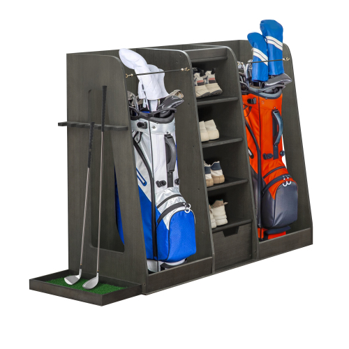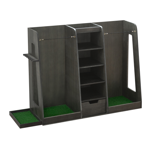 Product Name: 55.5''x16''x37''(LxWxH) Wooden Golf Bag Organizer and Storage Rack, High Quality Wooden 2 Golf Bag Rack with Drawers, Easy to Assemble Golf Club Holder/Stand with Club Holders on Side,Gray