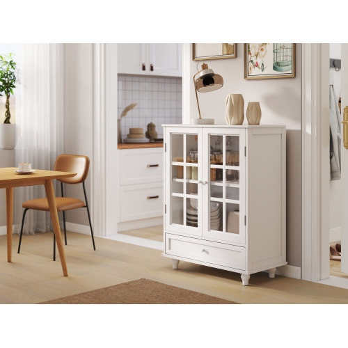 Minimalist White Buffet Cabinet with Double Glass Doors and Drawer, Modern Wooden Storage Sideboard Cupboard for Living room, Dining Room Hallway Entryway
