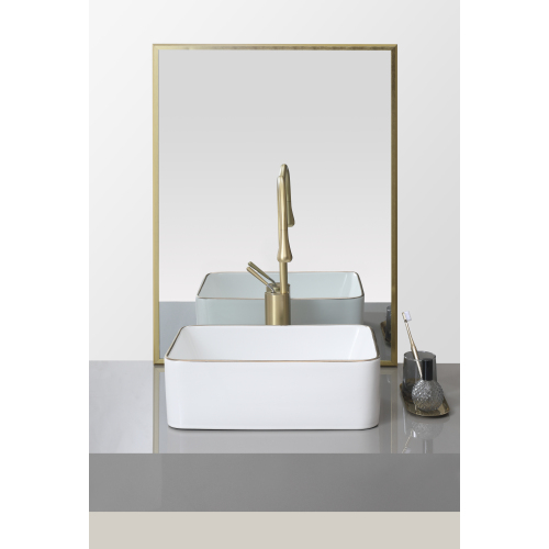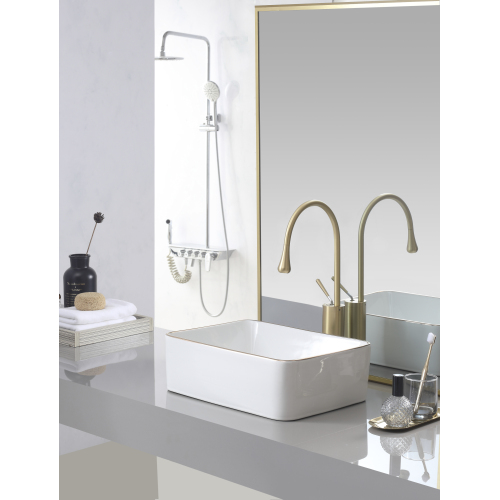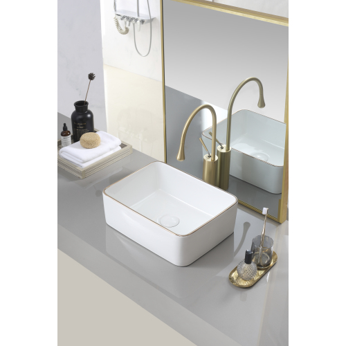 Product Name: White with gold trim Vessel Bathroom Sink Basin in White Ceramic Single Basin Ceramic Farmhouse Kitchen Sink with Basket Strainer