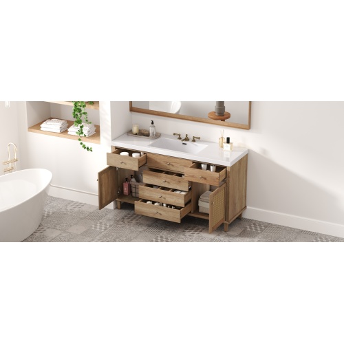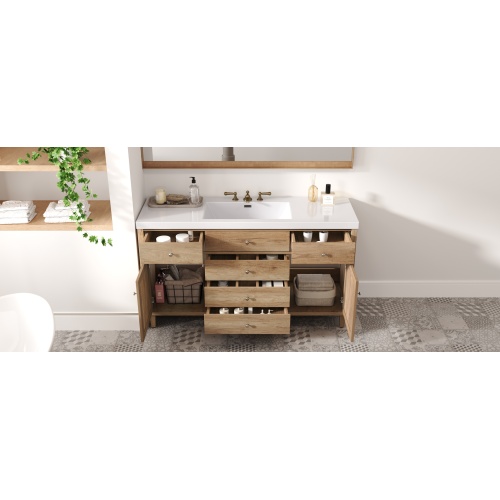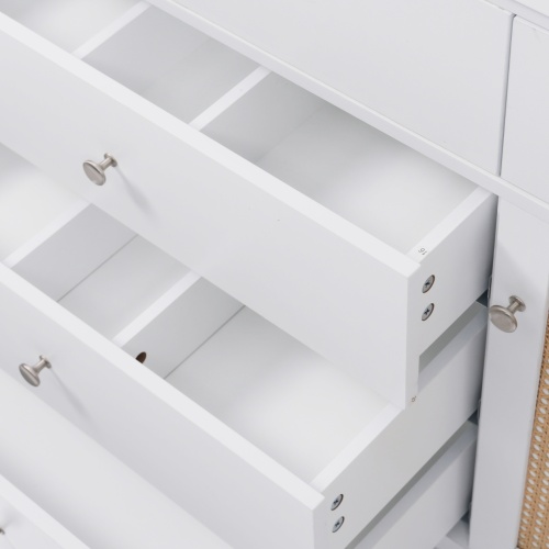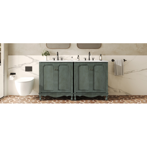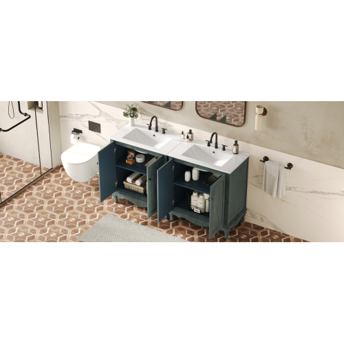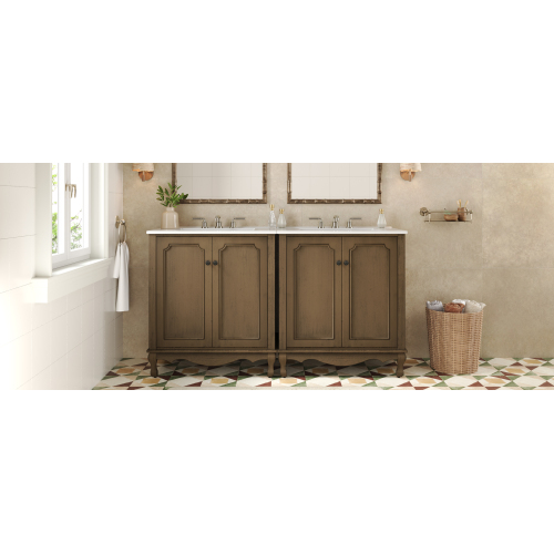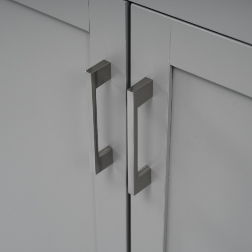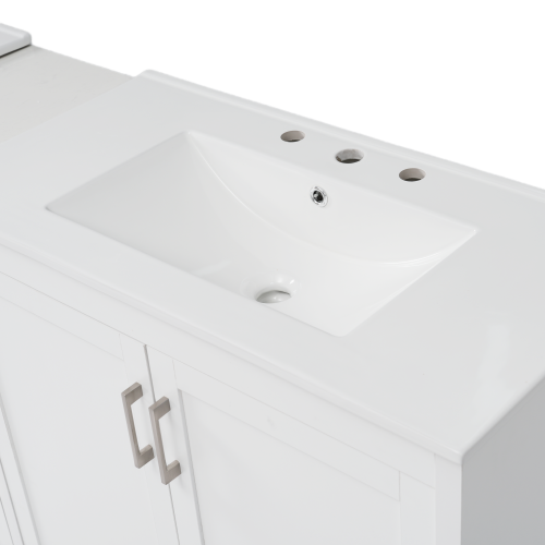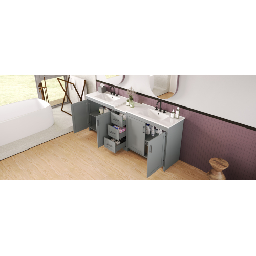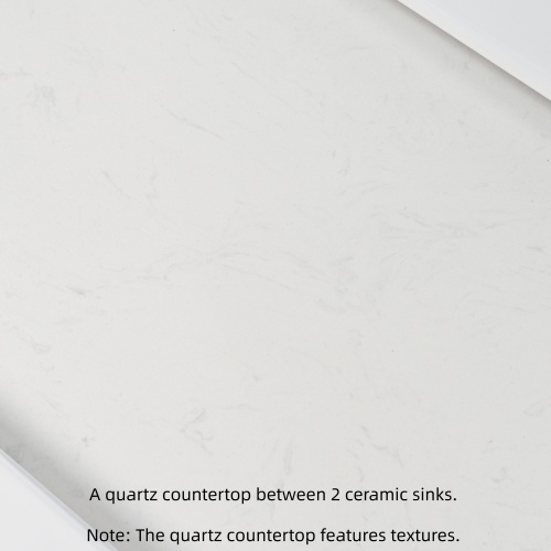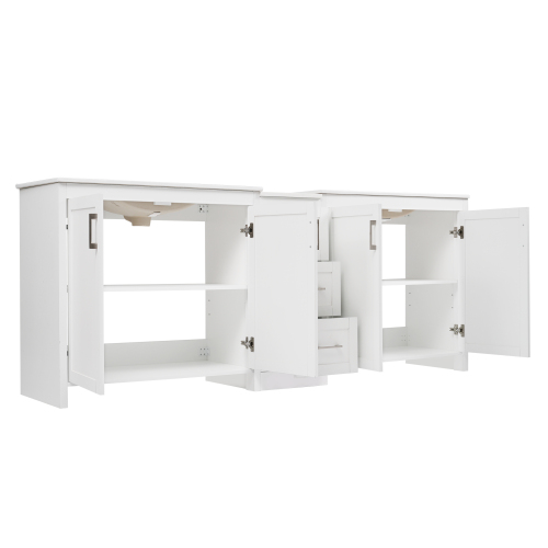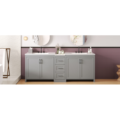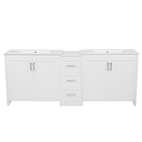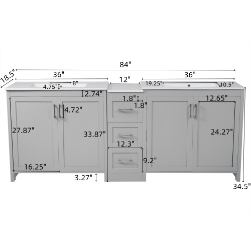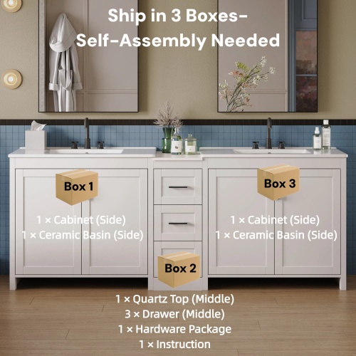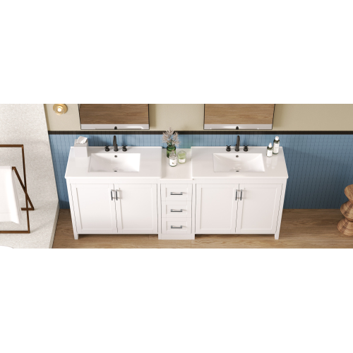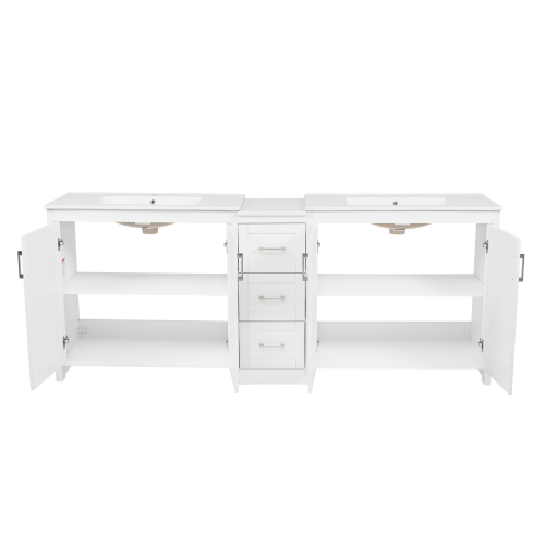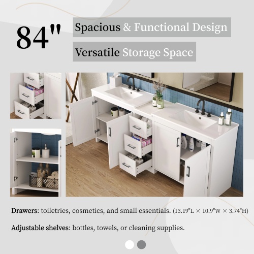 Product Name: 84" Double-Sink Bathroom Vanity, 2 Ceramic Sinks and a Quartz Countertop, with Adjustable Shelves and 3 Drawers, Large storage space, Silver Metal Handles and Soft Close Hinges Design, White