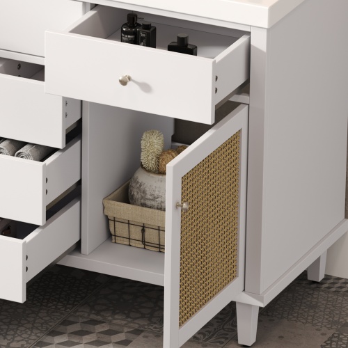 • 84" Double-Sink Bathroom Vanity, 2 Ceramic Sinks and a Quartz Countertop, with Adjustable Shelves and 3 Drawers, Large storage space, Silver Metal Handles and Soft Close Hinges Design, White