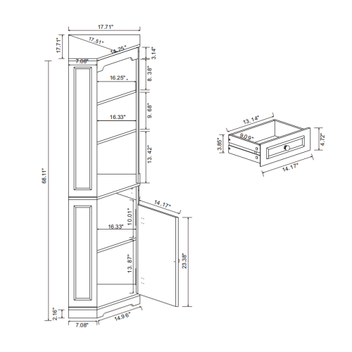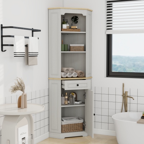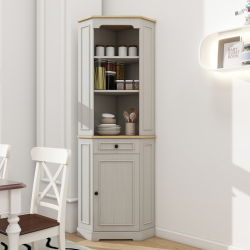 Product Name: 68" Tall Corner Cabinet, Freestanding Corner Storage Cabinet with 1 Door, 1 drawer and a Adjustable Shelf, Farmhouse Bar Storage Cabinet for Living Room, Dining room, Kitchen, Bathroom-Antique White