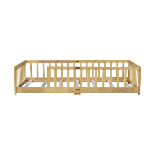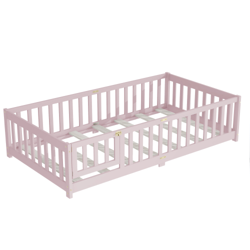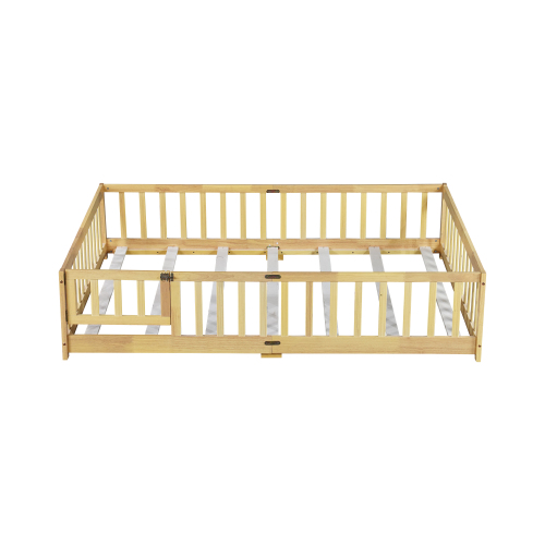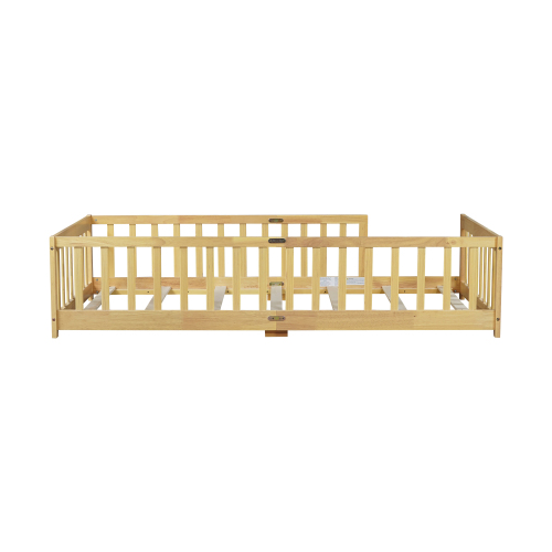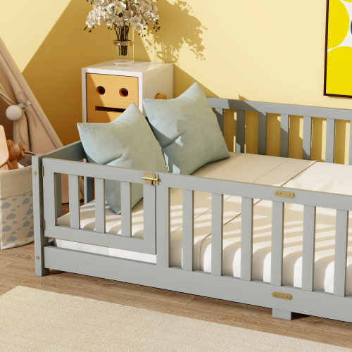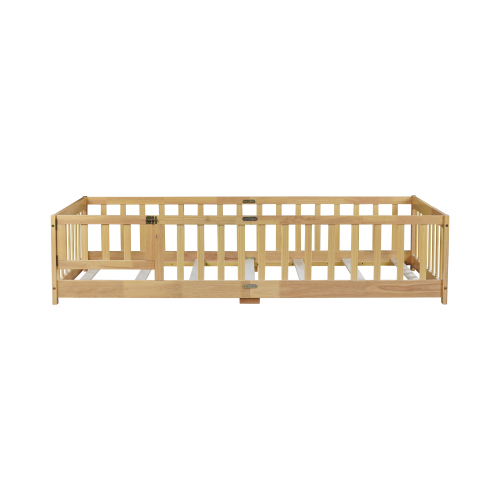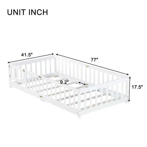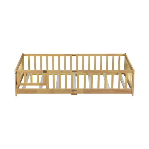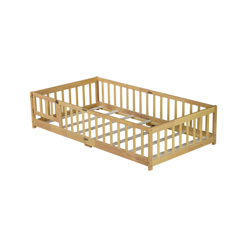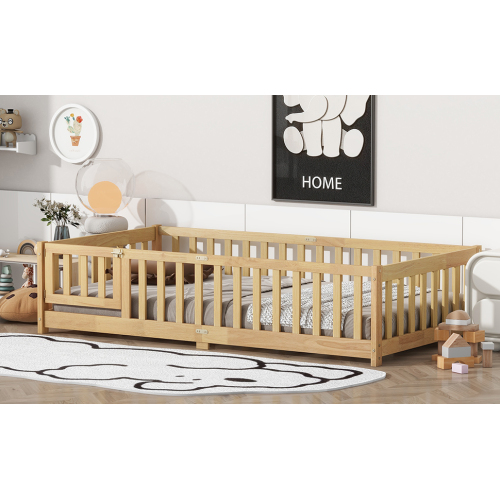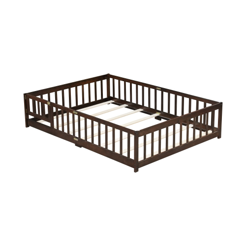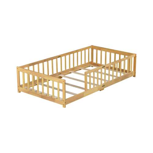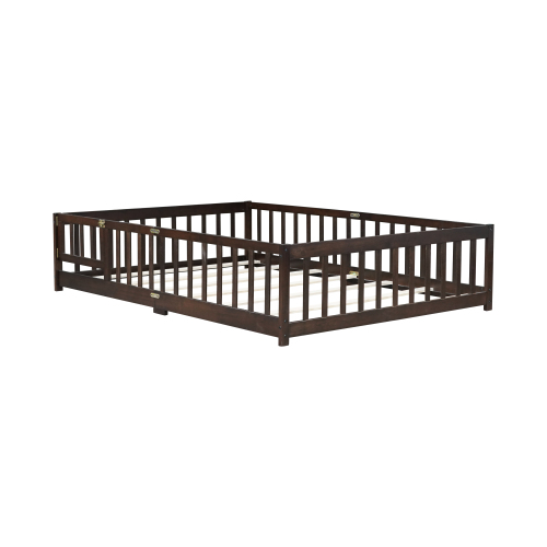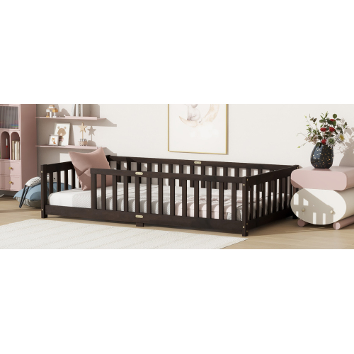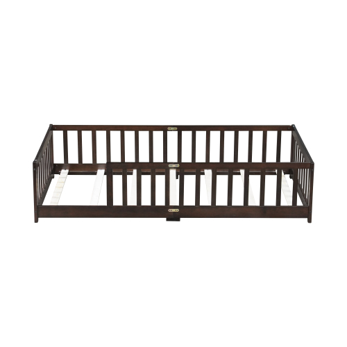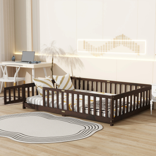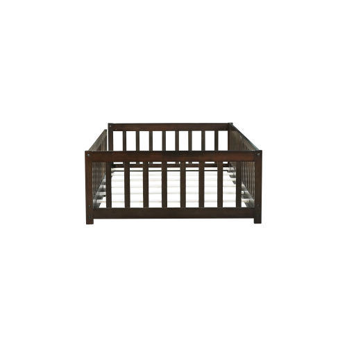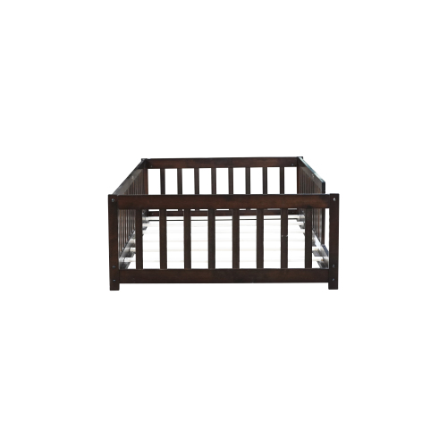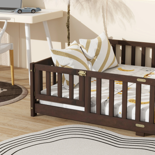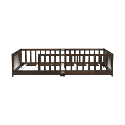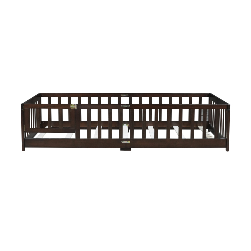 • Twin Size Floor Bed with Fence and Door,Rubber Wood Floor Bed with Safety Guardrails,Espresso