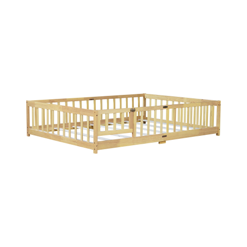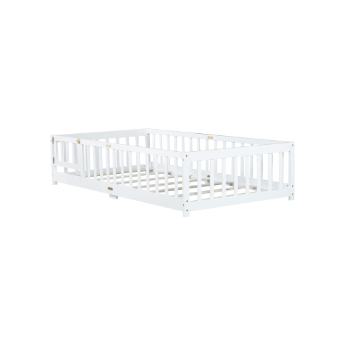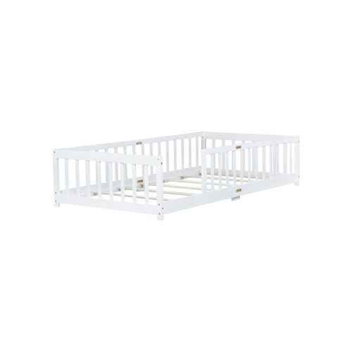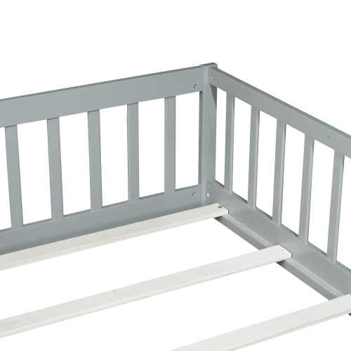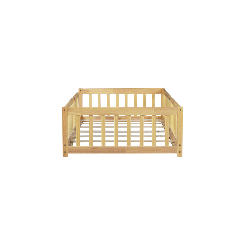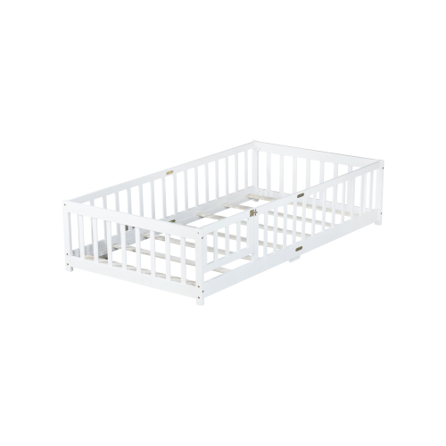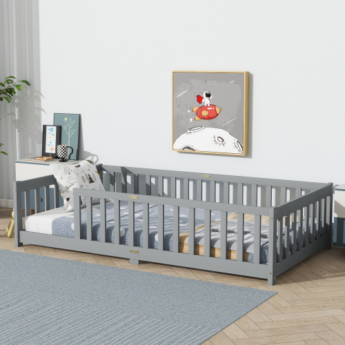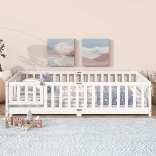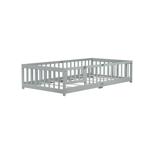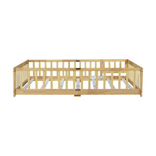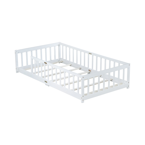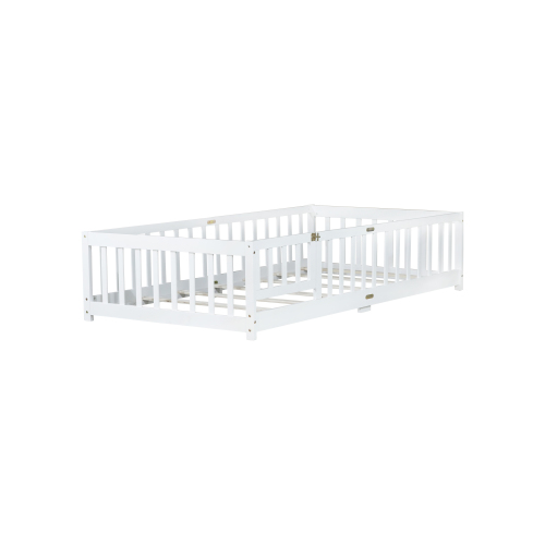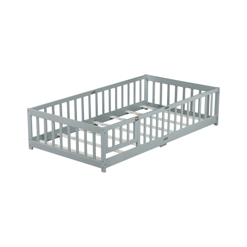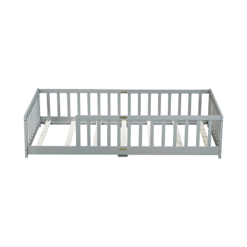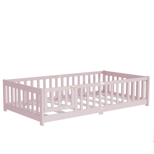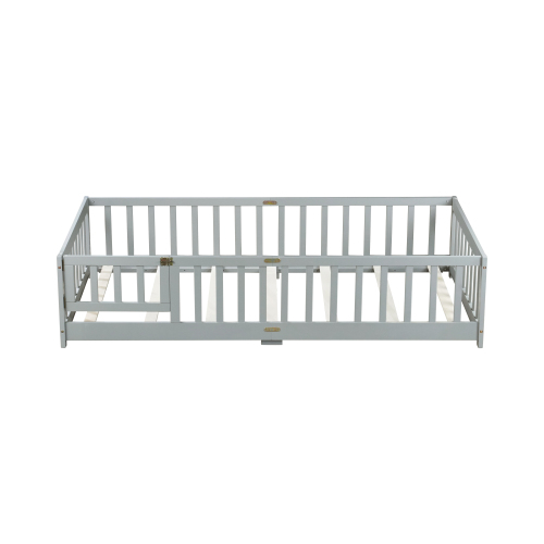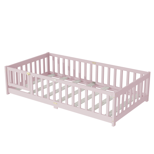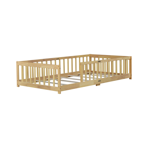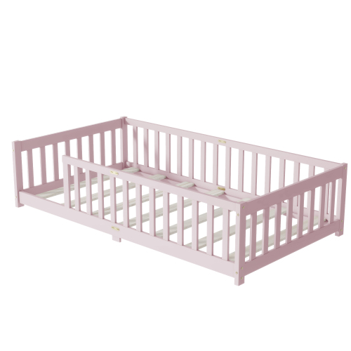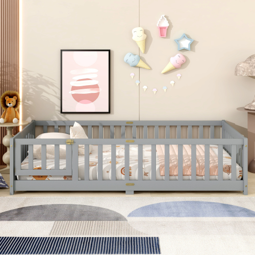 • Twin Size Floor Bed with Fence and Door,Rubber Wood Floor Bed with Safety Guardrails,Espresso