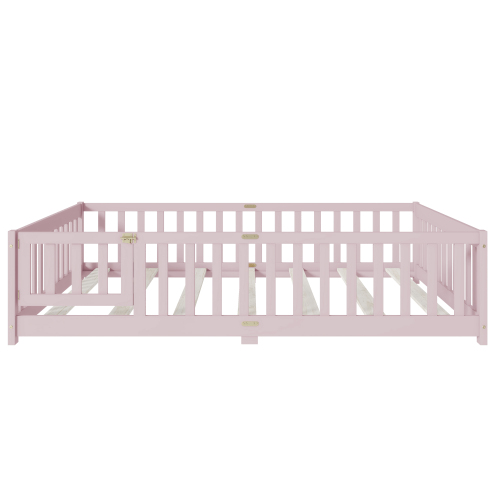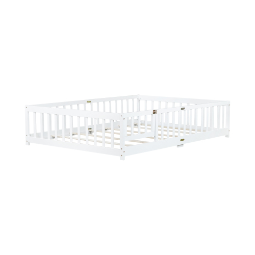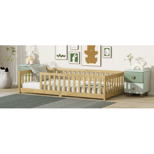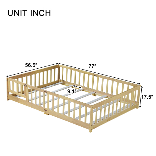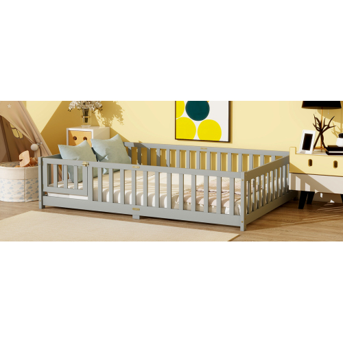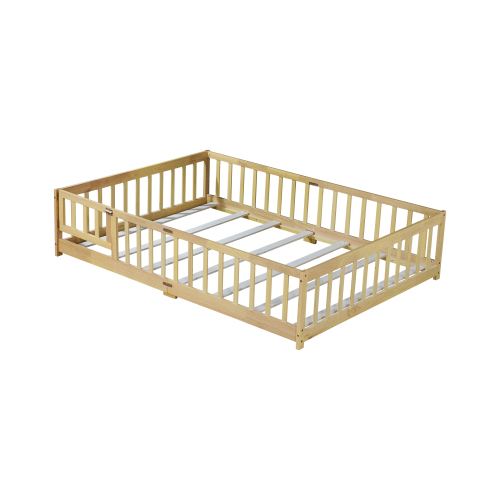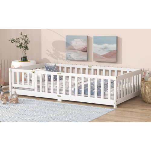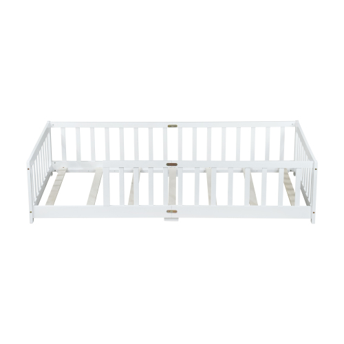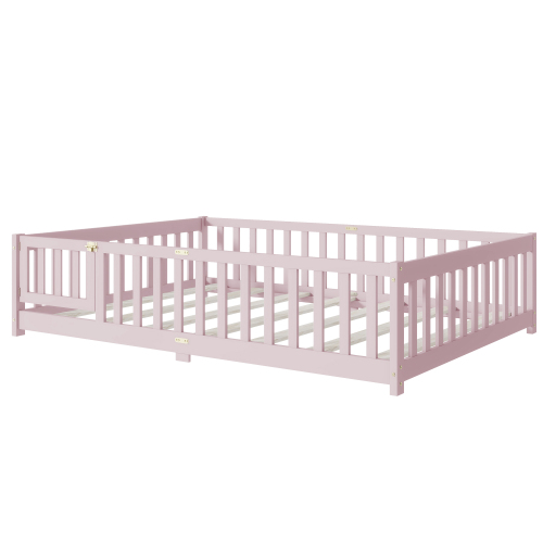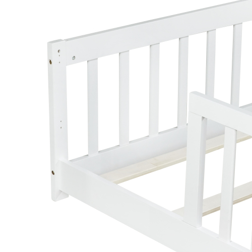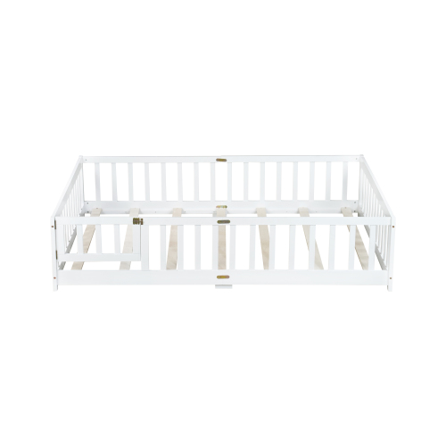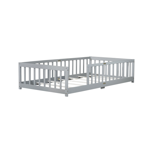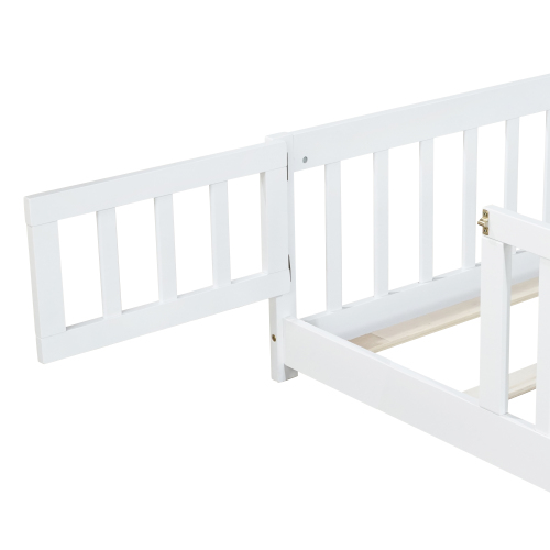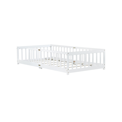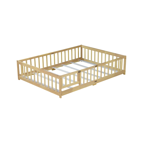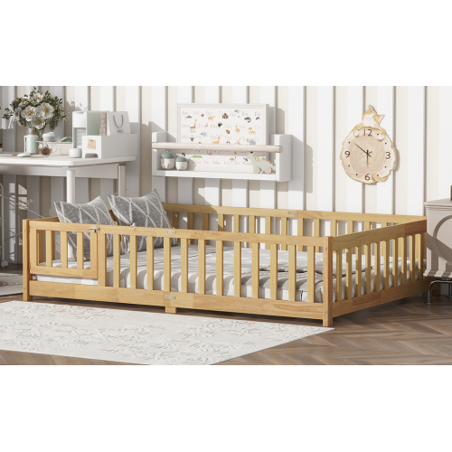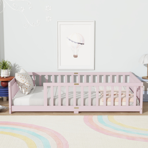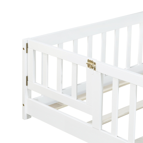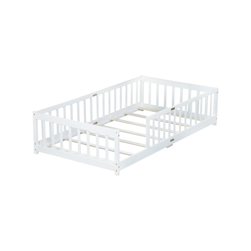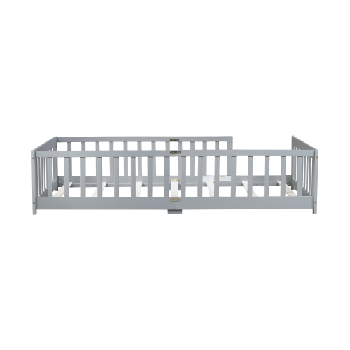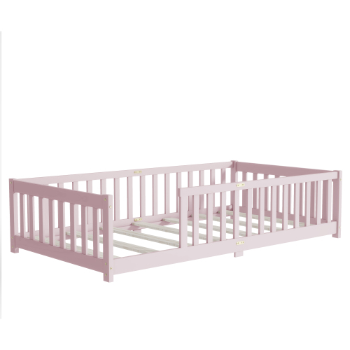 • Twin Size Floor Bed with Fence and Door,Rubber Wood Floor Bed with Safety Guardrails,Espresso