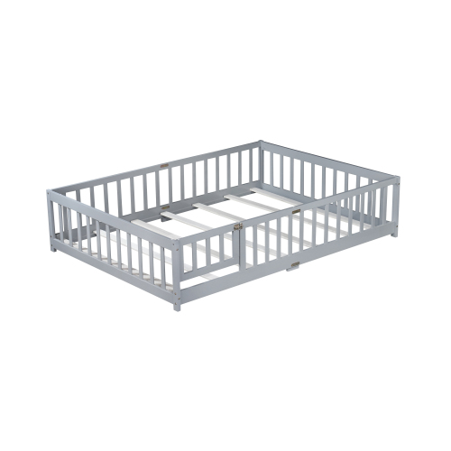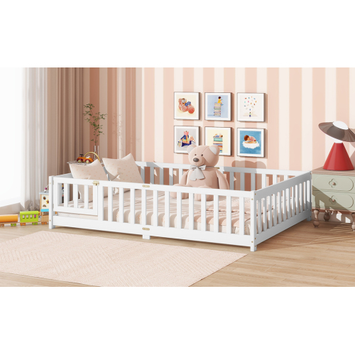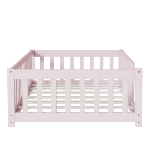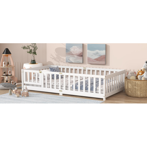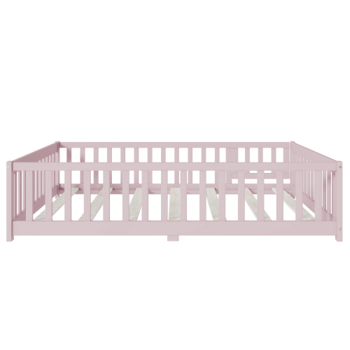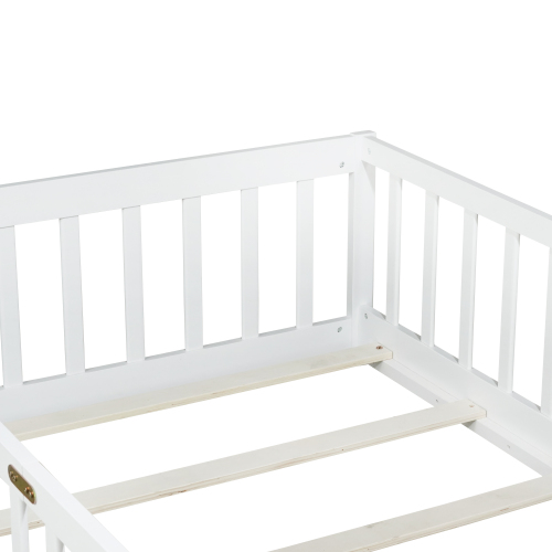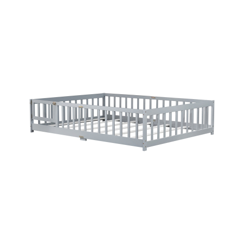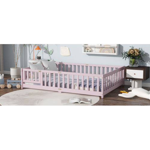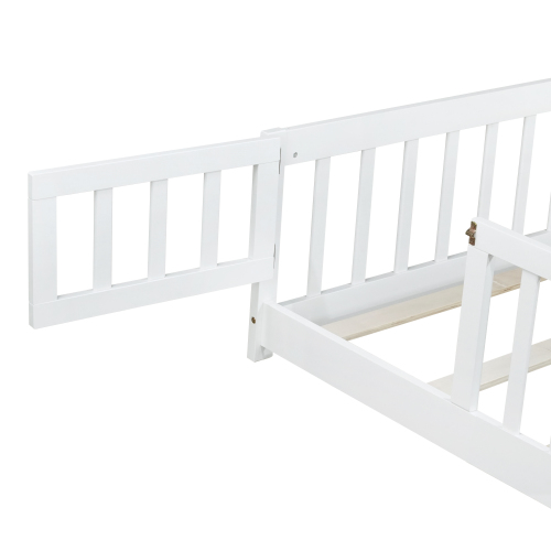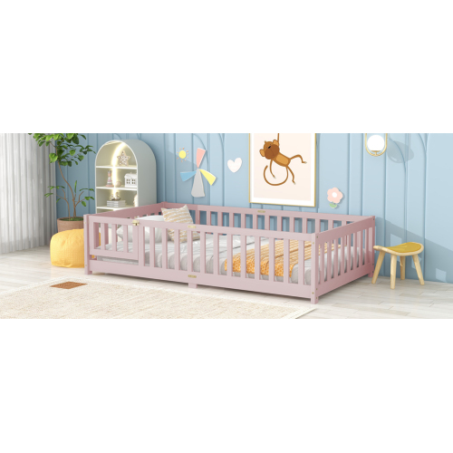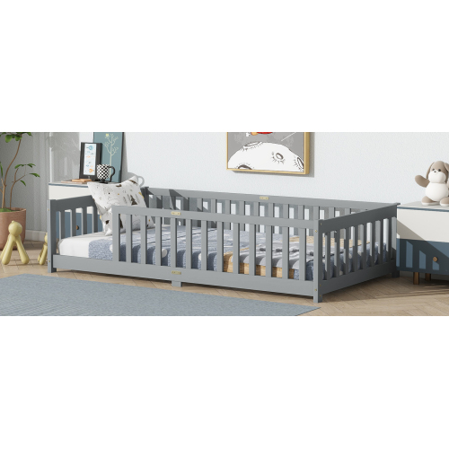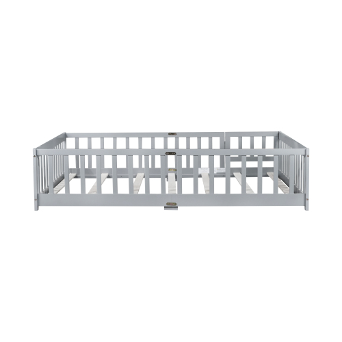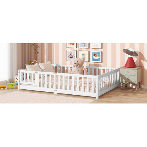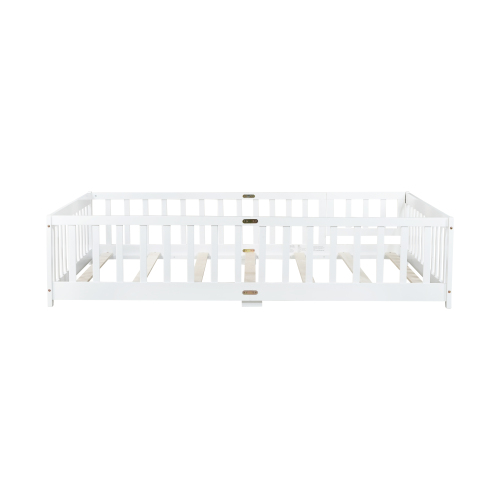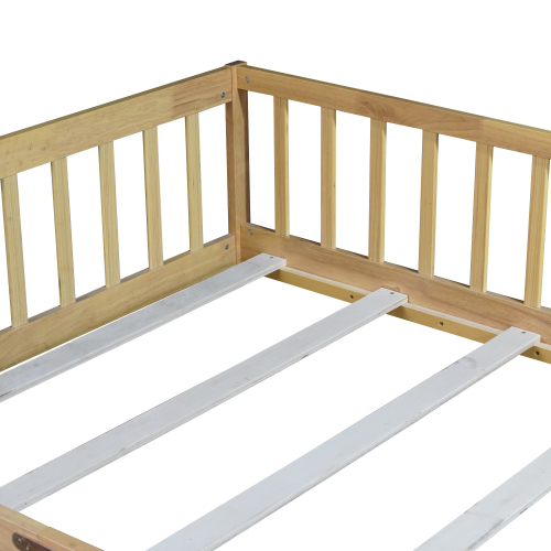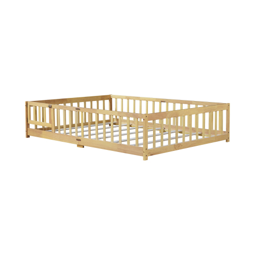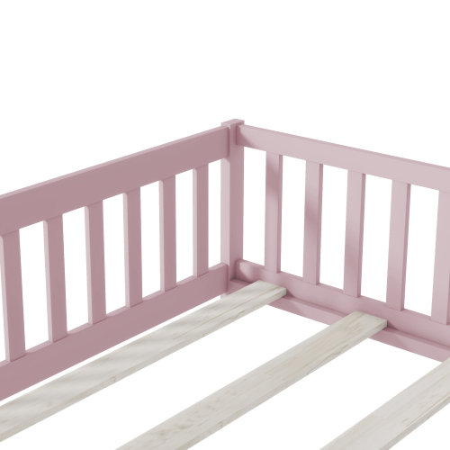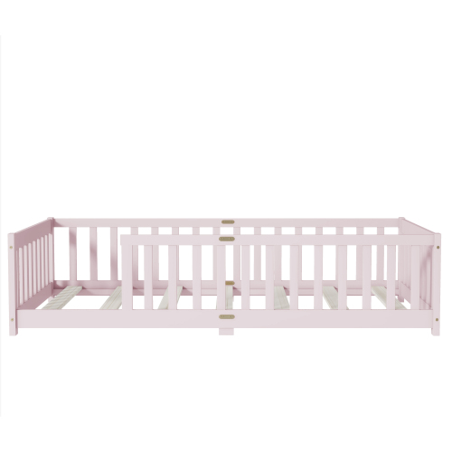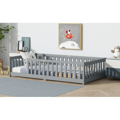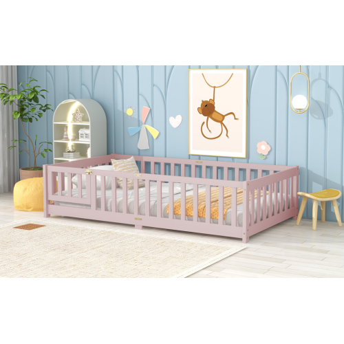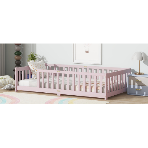 • Twin Size Floor Bed with Fence and Door,Rubber Wood Floor Bed with Safety Guardrails,Espresso