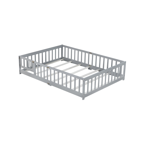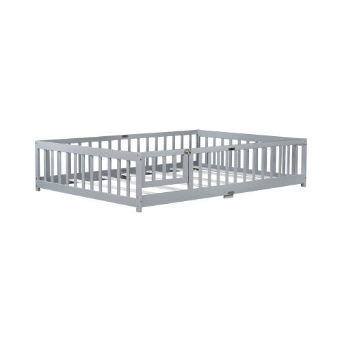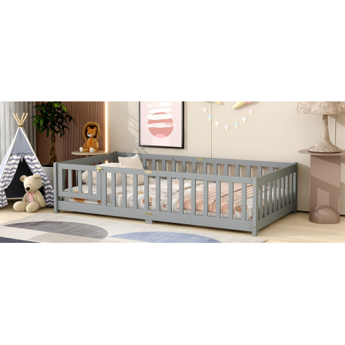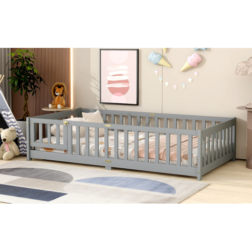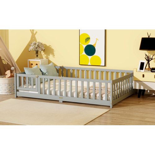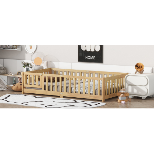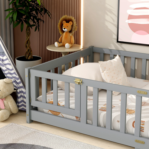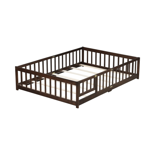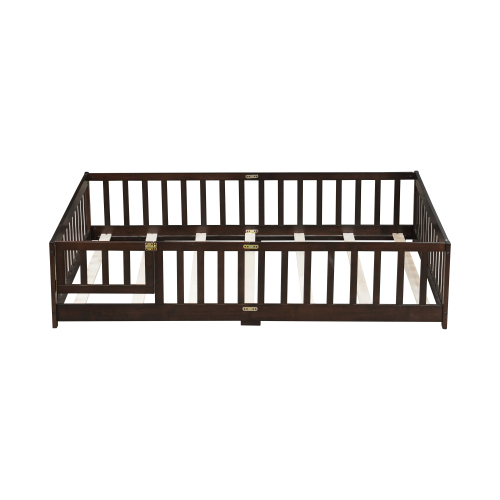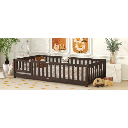 Twin Size Floor Bed with Fence and Door,Rubber Wood Floor Bed with Safety Guardrails,Espresso