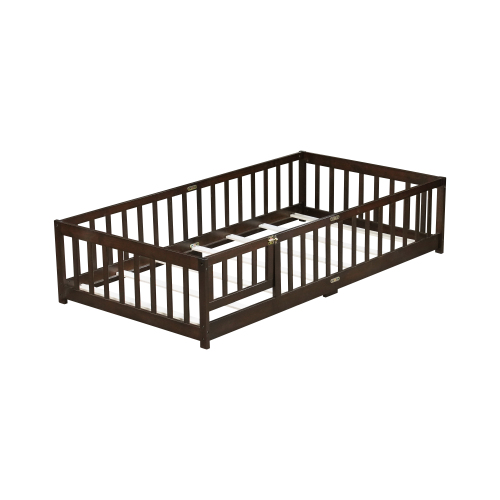 Product Name: Twin Size Floor Bed with Fence and Door,Rubber Wood Floor Bed with Safety Guardrails,Espresso