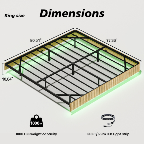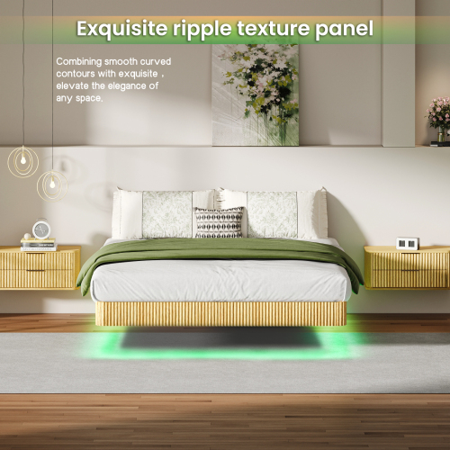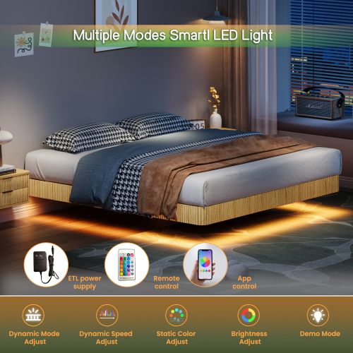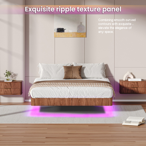 Product Name: Walnut King Floating Bed Frame with LED Lights, Wave Curve Wood Texture Bed with Heavy Duty Metal Slats - No Box Spring Needed.