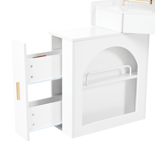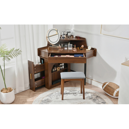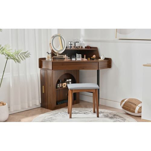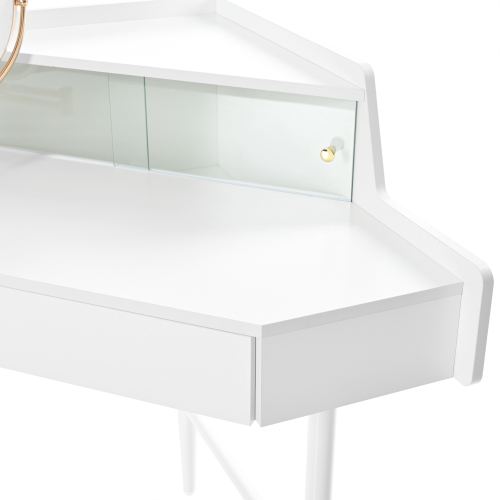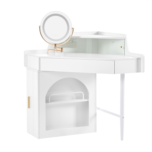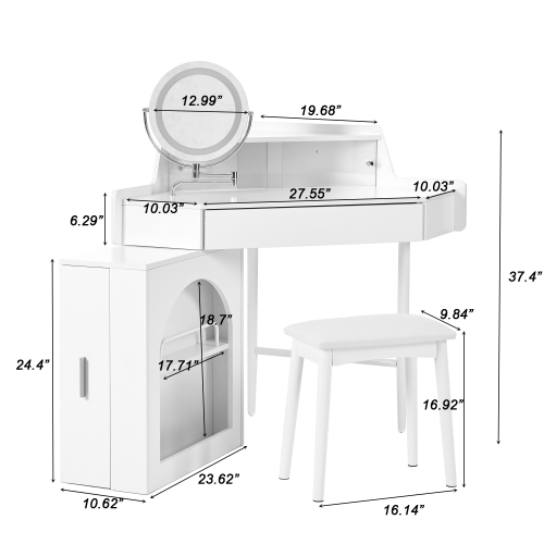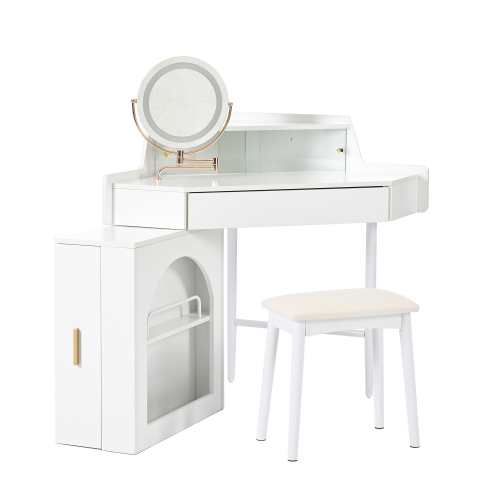 Product Name: Corner Makeup Vanity Desk With Mirror & LED Lights, Modern Vanity Set With Mirror And Stool, Dressing Table With Large Storage For Small Place, Brightness Adjustable Folding Mirror, White